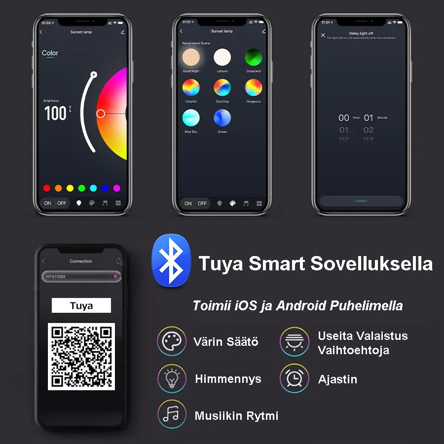 Älykkään sovelluksen (Tuya tai Smart Life) avulla voit hallita lamppua puhelimen kautta aktivoiden Bluetoothin. Sinun tarvitsee vain ladata sovellus. Siinä on musiikin rytmi- ja aikalaskenta-toiminto. Voit säätää värin tai himmentää valoa puhelimen kautta. Mukana on myös IR-kaukosäädin, jolla voit hallita valoa